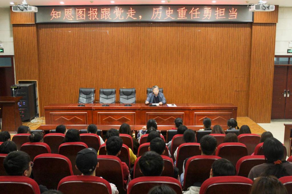 管理学院原党委书记、河南省老干部德育宣讲团成员郭培智老师做《知恩图报跟党走,历史重任勇担当》主题报告,院党委副书记马东辉、2019级辅导员胡雅雯以及院内入党积极分子到场聆听。