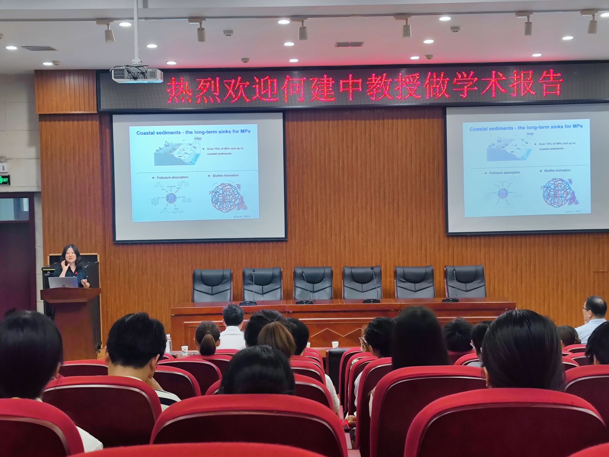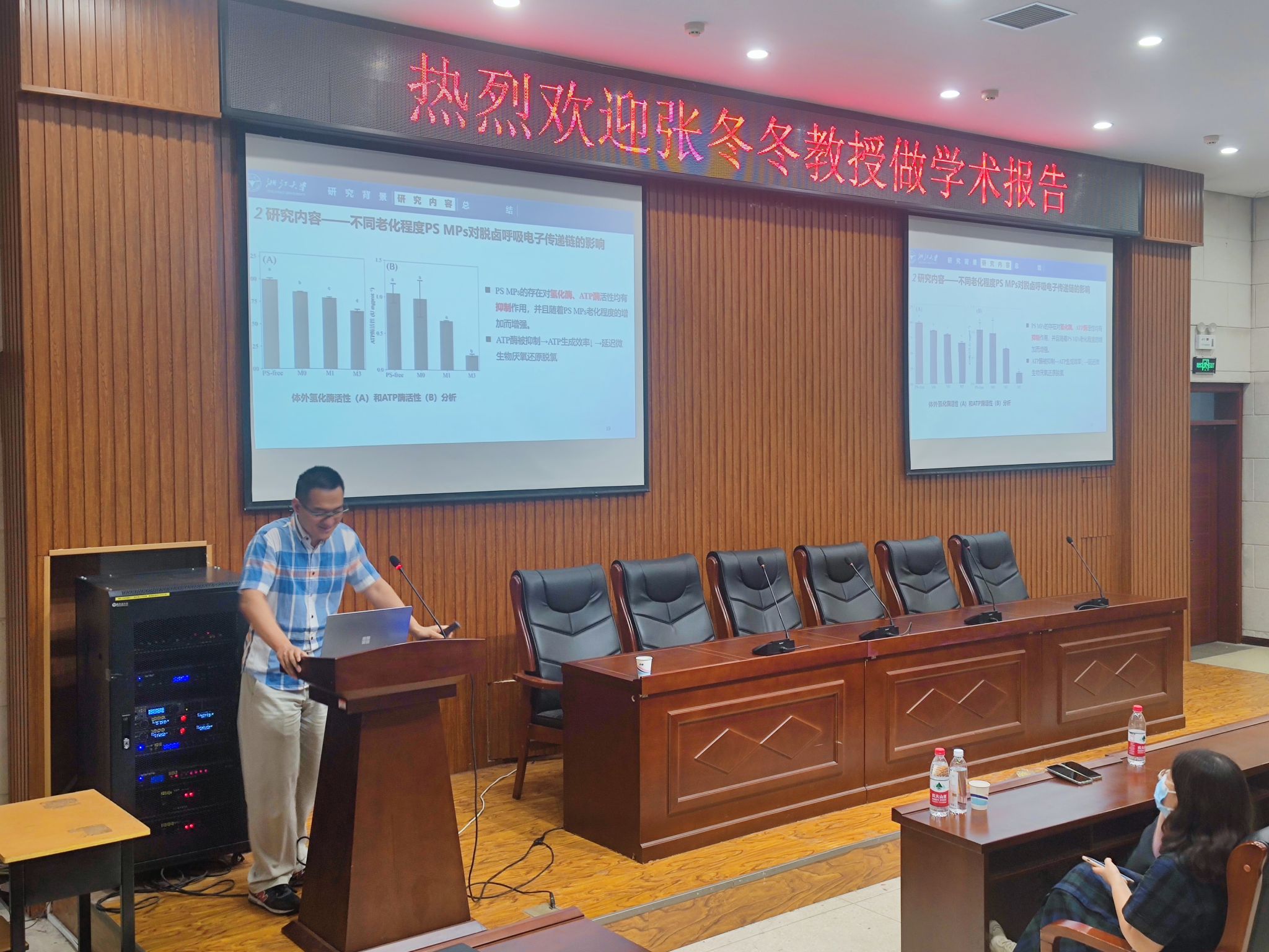 He JianZhong教授报告题目为《Microbial Hotspots on Microplastics for Dehalogenation of Emerging Contaminants》,何教授围绕微塑料对卤代有机污染物的生物转化和微生物群落的影响,重点阐述了脱卤功能微生物和微生物群落方面微塑料对微生物还原脱卤的影响机制。 Yang KunLin教授报告题目为《Green oligomerization processes for high-strength wastewater treatments》,杨教授课题组针对高浓度工业废水处理技术难题,开发了一种绿色、环保工艺,以尽量减少处理过程中所需的化学品数量,并减少废物污泥。通过氧化低聚反应或原子转移自由基聚合(ATRP)在水溶液中诱导污染物的沉淀。张冬冬副教授报告题目为《光老化微塑料对微生物还原脱卤代谢影响机制研究》,张教授重点介绍了光老化微塑料对微生物群落和脱卤呼吸电子传递链的影响机制。报告会后,何教授、杨教授和张教授与参会师生进行了广泛交流。
